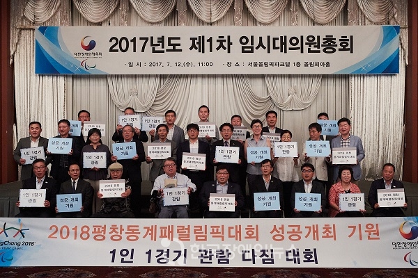 대한장애인체육회(회장 이명호)가 7월 12일 서울올림픽파크텔 올림피아홀에서 2018 평창 동계패럴림픽대회 성공 개최 및 참여 확대를 위한 ‘1인 1경기 관람 다짐대회’를 개최했다. 대한장애인체육회 회장 및 가맹경기단체장으로 구성된 대의원 30여 명이 이날 제1회 임시대의원 총회에 참석한 직후 이 행사에 참여했다.