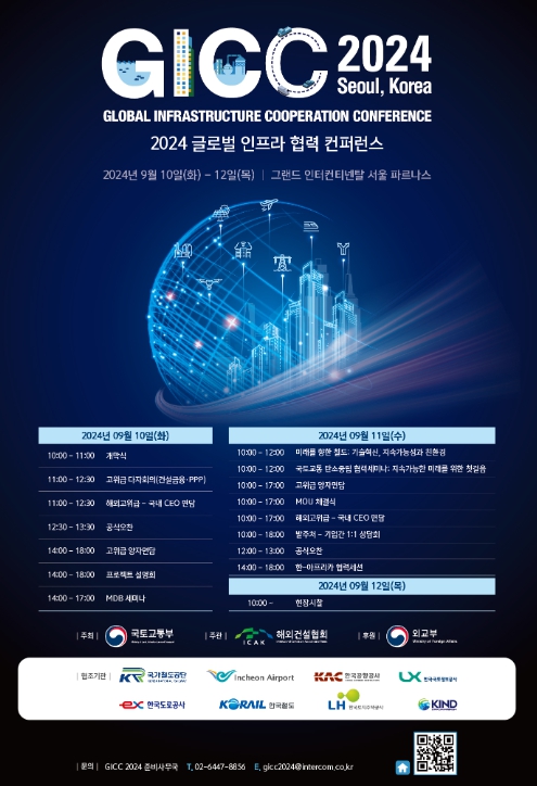 [한국장애인뉴스 강대학 기자] 국토교통부가 주최하고 해외건설협회(회장 한만희)가 주관하는 ‘2024 글로벌 인프라 협력 콘퍼런스’(Global Infrastructure Cooperation Conference, GICC)가 9월 10일부터 3일간 서울에서 개최된다.