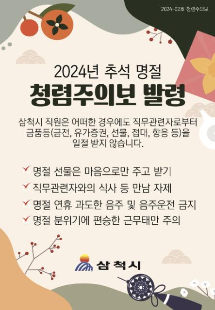 [한국장애인뉴스 김형만 기자] 삼척시가 추석명절을 맞아 연휴기간 동안 내부 직원들을 대상으로 청렴주의보를 발령한다고 밝혔다.