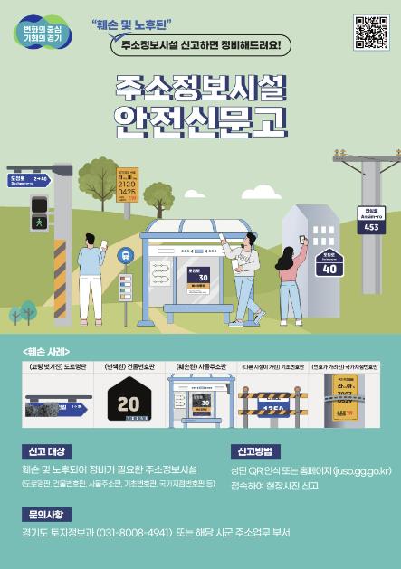 신고는 경기부동산포털 내 ‘주소정보시설 안전신문고’에 접속해 정비가 필요한 주소정보시설의 사진과 신고 내용을 입력한 후 제출하면 된다.