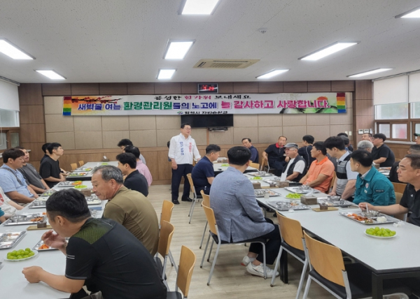 이번 방문은 추석 연휴에도 불구하고 시민들의 쾌적한 도시환경을 유지하기 위해 모두가 잠든 새벽 현장에서 묵묵히 노력하고 있는 환경관리원들의 수고를 격려하기 위한 것으로, 최기문 시장 및 시 관계자들은 현장근로자 50여 명과 아침 식사를 같이하며 현장 근무에 대한 애로사항을 직접 듣기 위해 마련됐다.